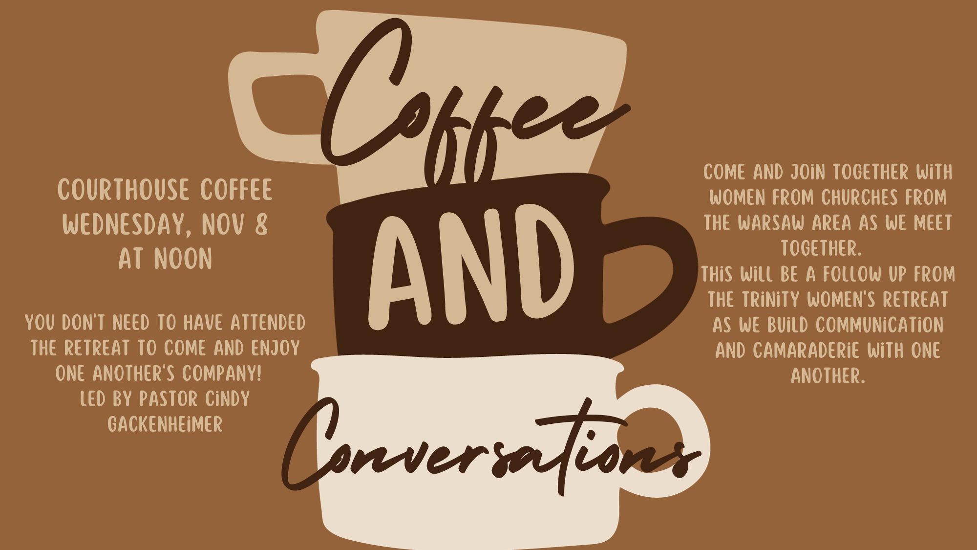 Come and join together with women from churches from the Warsaw area as we meet together. This will be a follow up from the Trinity Women’s retreat as we build communicaton and camaraderie with one another. You don’t need to have attended the retreat to come and enjoy one another’s company!