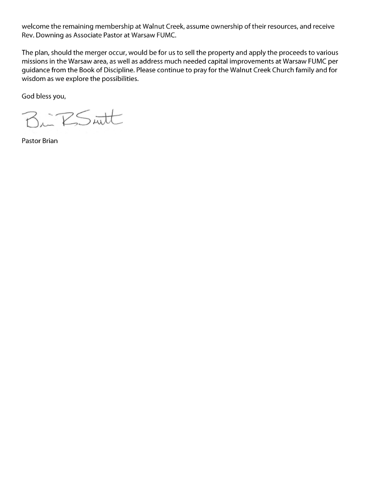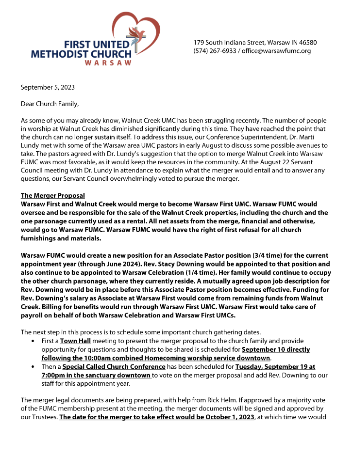 A Charge Conference will take place Tuesday, September 19, at 7:00 p.m. at 179 S Indiana Street – Membership of Warsaw First UMC will gather for a special-called church conference to vote on the proposed merger between First and Walnut Creek. Only full members can vote.